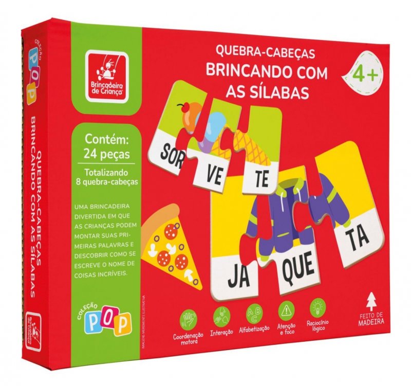 O Quebra-Cabeça Madeira Brincando com Sílabas é uma ferramenta educativa divertida que ajuda as crianças a aprenderem sobre sílabas de maneira lúdica! Com 24 peças coloridas, este quebra-cabeça estimula o desenvolvimento da coordenação motora, o raciocínio lógico e a consciência fonológica. As crianças poderão montar as peças, formando palavras e brincando com as sílabas, promovendo o aprendizado enquanto se divertem. Feito de madeira de alta qualidade e com acabamentos seguros, é ideal para momentos de diversão em família.