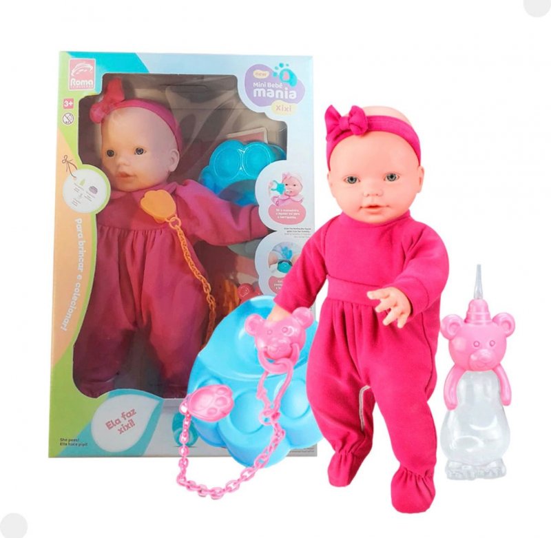 A Boneca New Mini Bebê Mania Xixi vai encantar as crianças! Essa bebezinha delicada toma mamadeira e faz xixi de verdade ao apertar a barriguinha. Acompanha roupinha charmosa, faixa de cabeça, penico, mamadeira, chupeta e prendedor para deixar a brincadeira ainda mais completa e divertida.