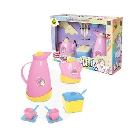 Unika hora do café contém um conjunto com temática unicórnio, adesivado, todo em cores pastéis. Contém: 1 garrafa, 1 bule, 2 pires, 2 xícaras, 3 colheres, 1 açucareiro. as cores podem variar de acordo com a disponibilidade.