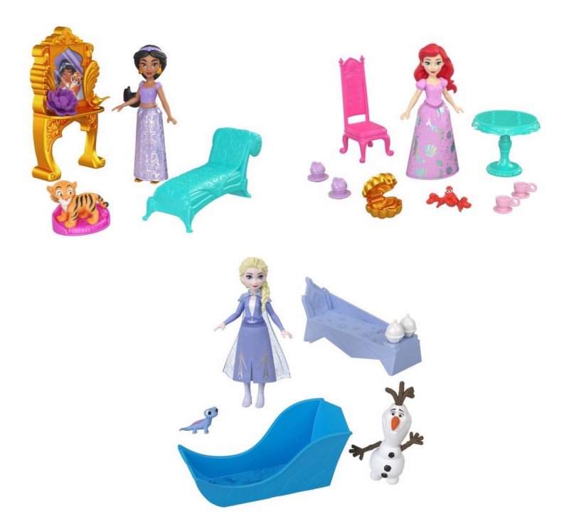Reviva os momentos mágicos dos filmes da Disney com estas pequenas bonecas de 8 cm e seus amigos personagens. Cada conjunto inclui uma boneca com saia macia removível e de quatro a sete peças para brincar e criar histórias encantadoras. Modelos variados.