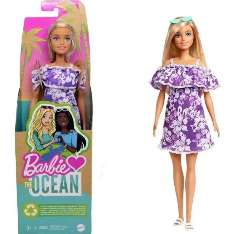 A Barbie Malibu possui um vestido floral com babado e acessórios como óculos de sol, tudo feito de material reciclado. Essa boneca traz diversão inspirada na praia.