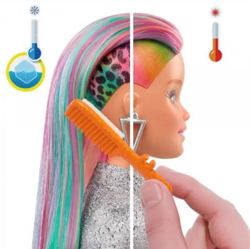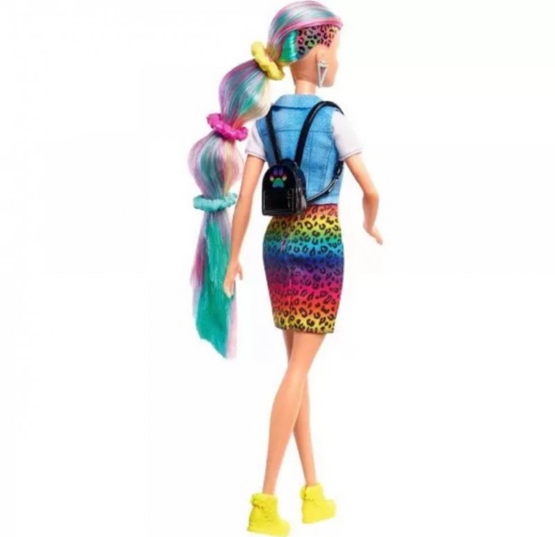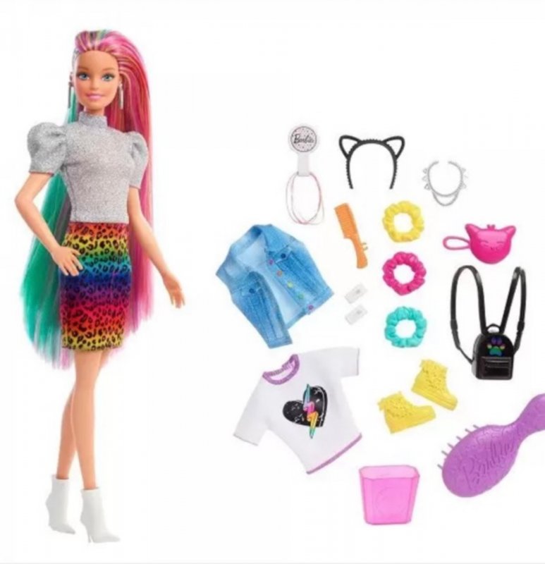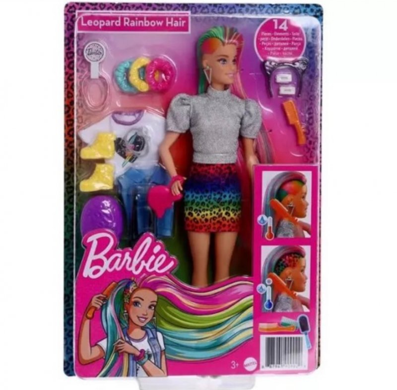 O estilo da Barbie não tem limites! Com a Barbie de cabelos arco-íris e estampa de leopardo, as crianças podem explorar cores e estilos diferentes. Escove os longos cabelos arco-íris para revelar um visual colorido e use água fria para ativar a estampa de leopardo na lateral.