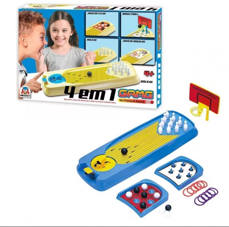 Com este brinquedo, a diversão é garantida em quatro modalidades diferentes. O 4 em 1 Game inclui jogo de argola, jogo da velha, basquete e boliche, permitindo que as crianças criem sua própria mini olimpíada. Fácil de montar e sem necessidade de pilhas, é uma opção interativa e envolvente para todas as idades.