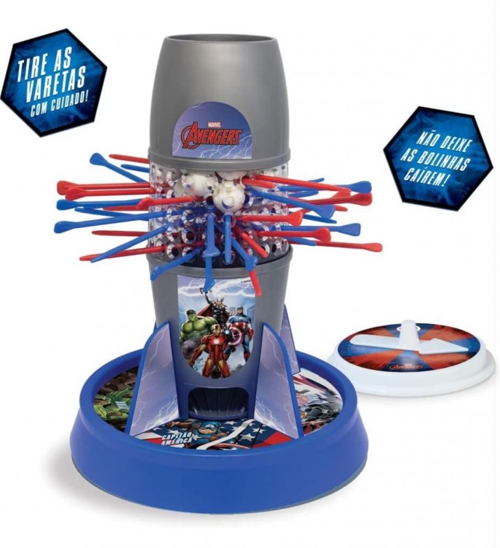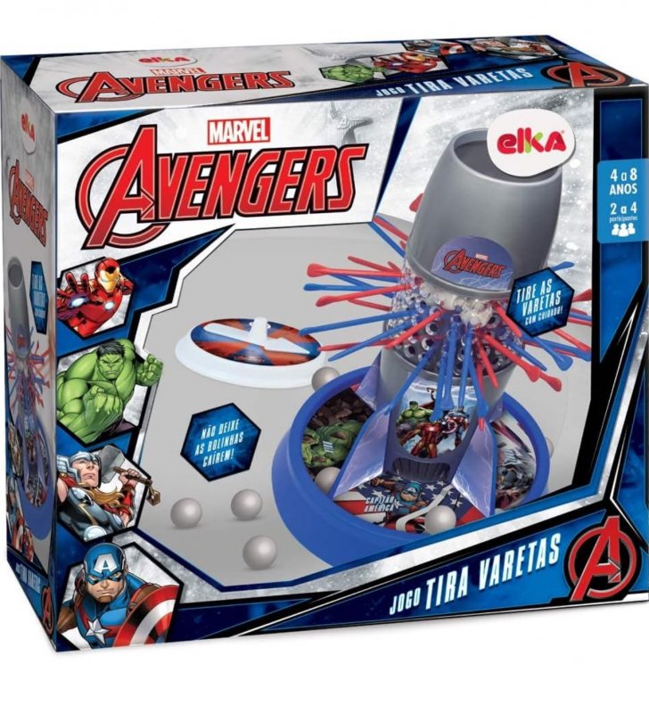Ajude os vingadores nesta disputa emocionante. O jogo Tira Varetas é pura diversão! Coloque as bolinhas dentro da torre, gire a roleta e vá puxando as varetas; mas, cuidado, pois só quem deixar cair menos bolinhas será o vencedor. Especificações do produto: Marca: Elka Dimensões aproximadas: 20 x 20 x 28 cm; 415 g Idade recomendada: +4