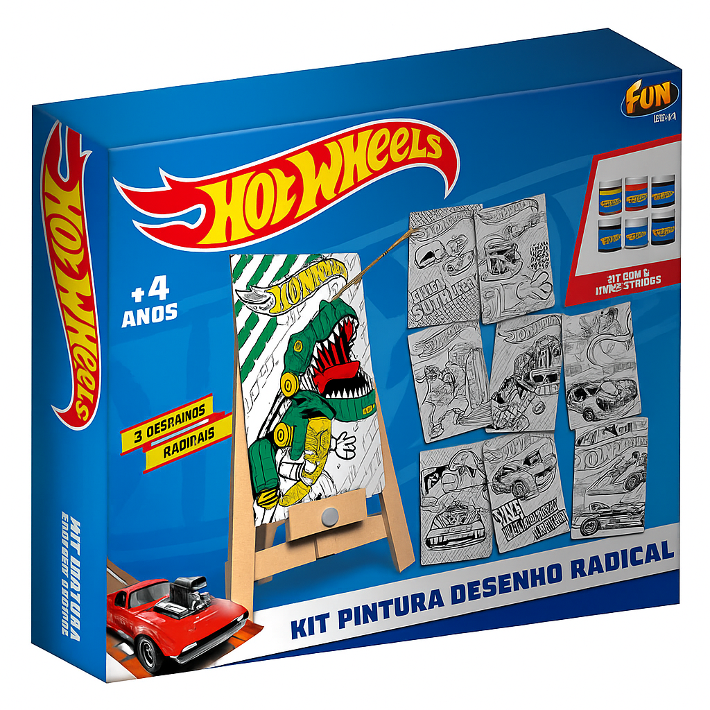 Criatividade e diversão sobre rodas! Com o Kit de Pintura Hot Wheels, a criança monta seu próprio cavalete e solta a imaginação colorindo cenas radicais já estampadas. A atividade estimula o uso das cores, das formas e o foco dos pequenos artistas. O brinquedo acompanhar 06 tintas e pincel.