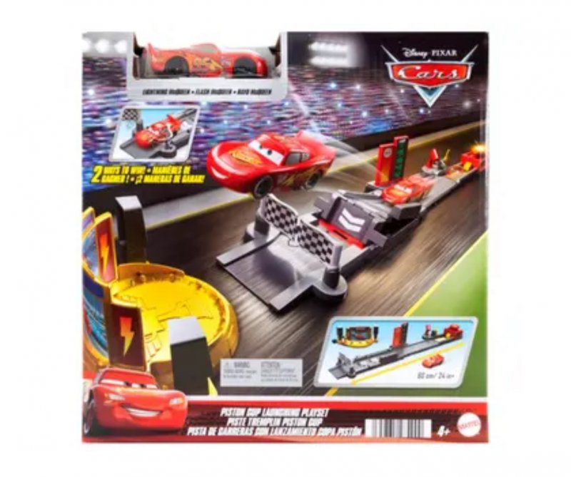 Relâmpago McQueen está pronto para acelerar! No Playset da Copa Pistão, as crianças exploram duas formas de brincar: na corrida, é só preparar o carrinho no pit stop, colocá-lo no lançador e vê-lo atravessar as bandeiras giratórias; já na acrobacia, é possível levantar a rampa e fazer o McQueen saltar direto para o círculo do vencedor! A pista ainda permite ajustar a dificuldade, garantindo novos desafios a cada rodada.