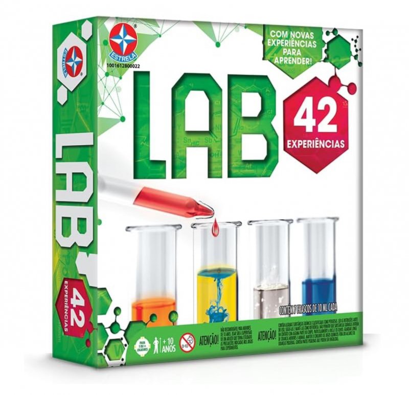 Um laboratório de química em casa! Com o LAB 42 da Estrela, a criança realiza até 42 experiências, como misturar substâncias, identificar soluções ácidas e básicas e observar mudanças de cor. Acompanha tubos de ensaio, pipetas, frascos com soluções, óculos de proteção e manual. Uma brincadeira educativa que estimula a curiosidade e o gosto pela ciência!