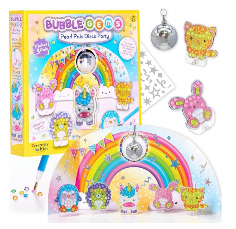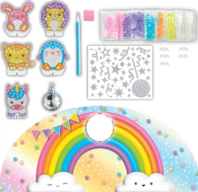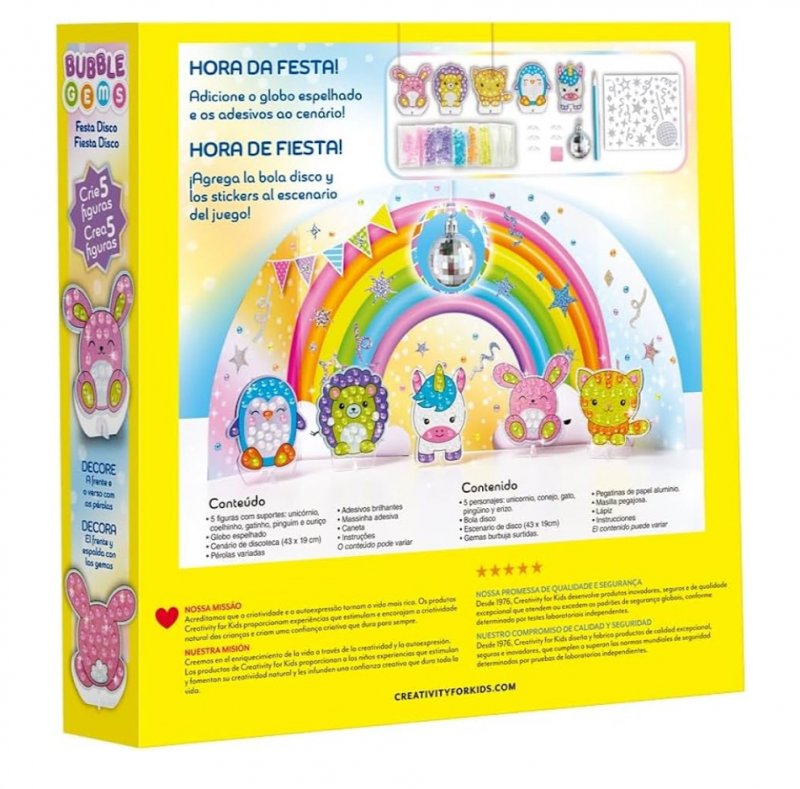 Um kit criativo para decorar personagens fofos com pérolas coloridas e brilhantes. O cenário vem com figuras, adesivos e até um globo espelhado, formando um palco cheio de brilho e diversão. Estimula criatividade, coordenação motora fina e foco, sendo uma ótima opção de presente educativo.