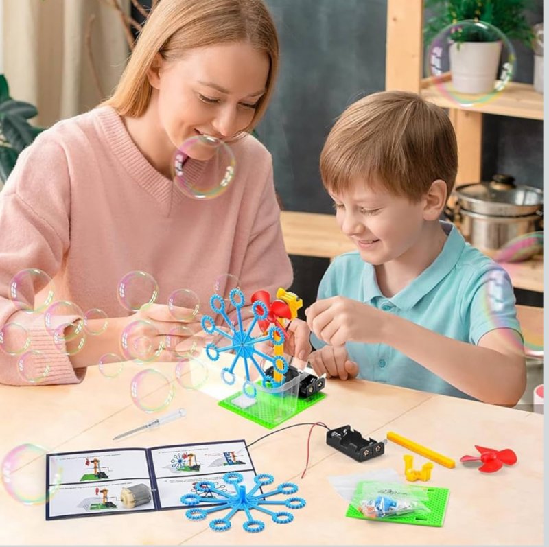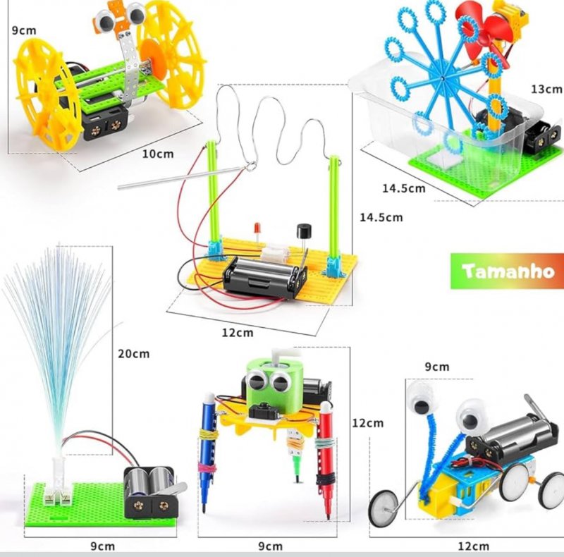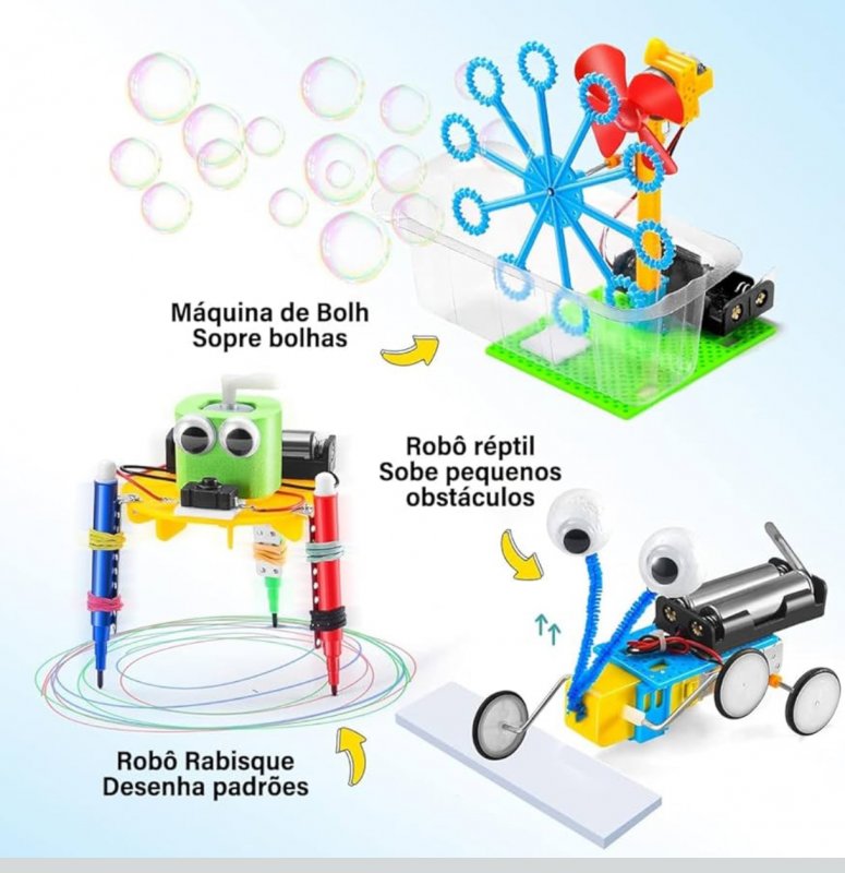 Este conjunto 6 em 1 permite montar diferentes invenções: máquina de bolhas, robô de rabiscos, carro de equilíbrio, robô réptil, luz de fibra e jogo com fio de campainha. Enquanto se divertem, as crianças aprendem conceitos de Ciência, Tecnologia, Engenharia e Matemática (STEM), desenvolvendo criatividade, raciocínio e solução de problemas. Fácil de montar e seguro, é também uma ótima opção de presente para jovens inventores.