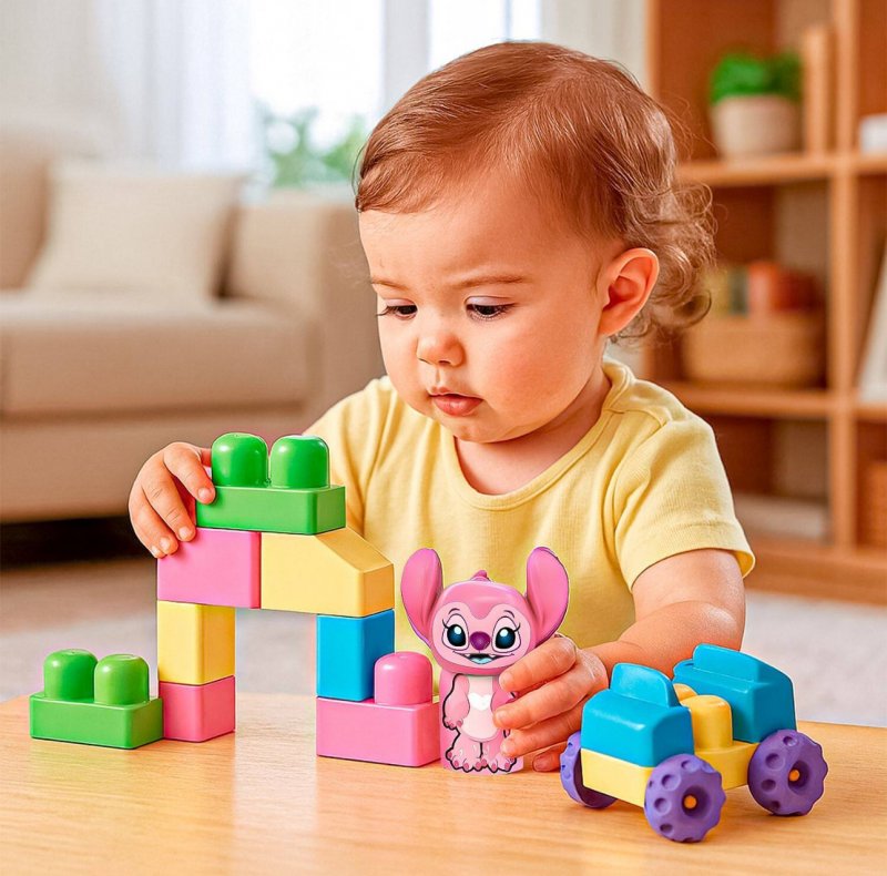 Blocos de montar com a personagem Angel, ideais para as primeiras descobertas das crianças. As peças são grandes, coloridas e fáceis de encaixar, ajudando a desenvolver coordenação motora e criatividade.